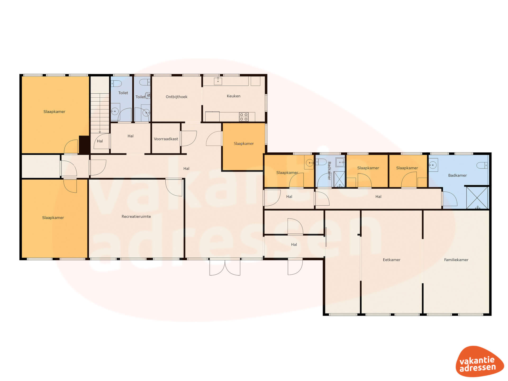 Das Haus verfügt über 6 Schlafzimmer, darunter 2 geräumige Zimmer für 6 Personen und 4 Zimmer für 2 Personen. Die sanitären Einrichtungen bieten viel Komfort: Im Keller befindet sich ein großer Raum mit 3 Duschen und 4 Waschbecken, während das Erdgeschoss 2 weitere moderne Badezimmer mit Dusche, Toilette und Waschbecken bietet. Darüber hinaus gibt es eine separate Toilette. Ein Kinderstuhl und ein Kinderbett machen das Haus besonders familienfreundlich. Das gesamte Haus ist rauch- und haustierfrei, sodass Sie sich auf eine frische und saubere Umgebung verlassen können.