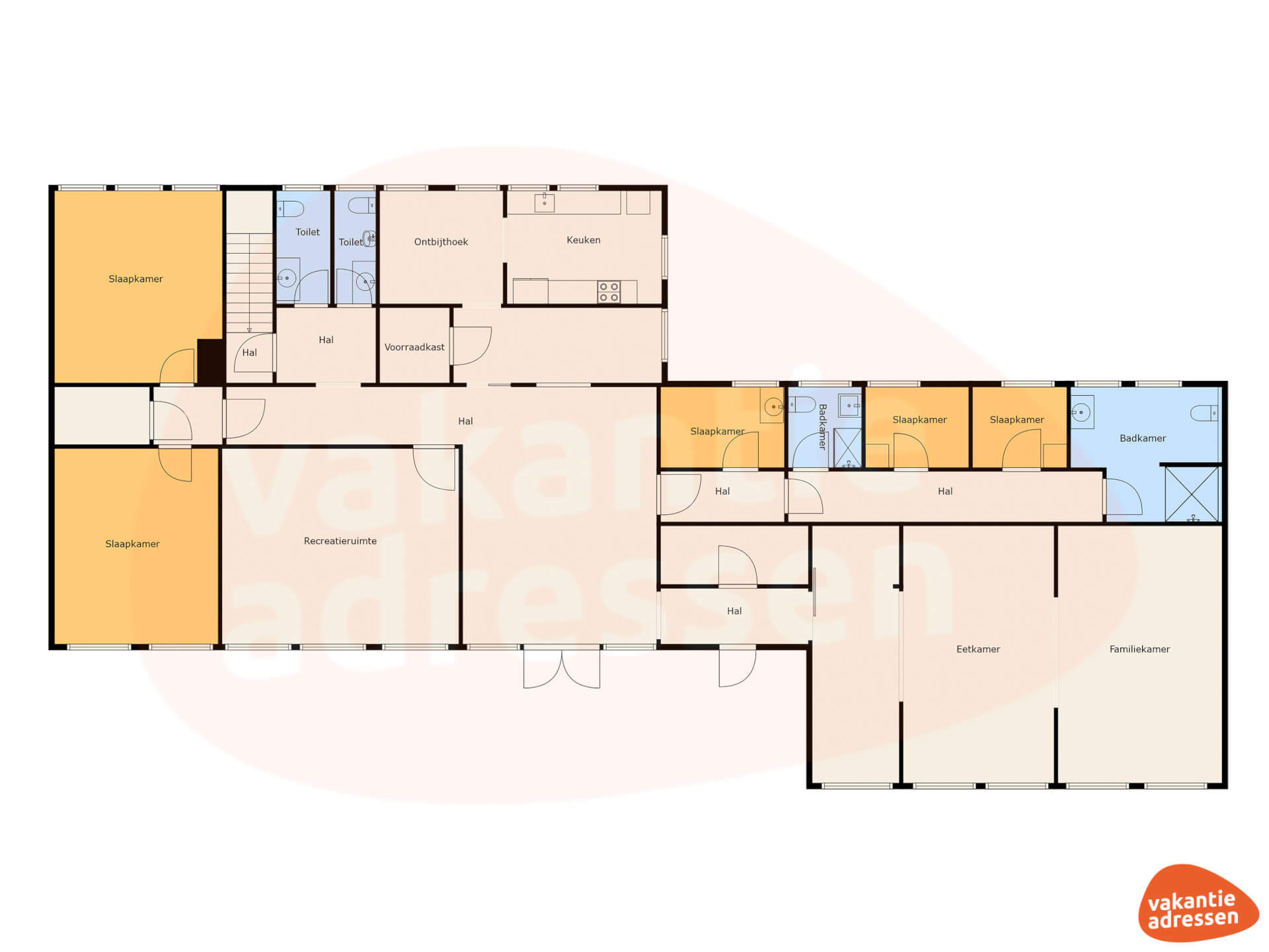 Das Haus verfügt über 5 Schlafzimmer, darunter 2 geräumige Zimmer für 6 Personen und 3 Zimmer für 2 Personen. Die sanitären Einrichtungen bieten viel Komfort: Im Keller befindet sich ein großer Raum mit 3 Duschen und 4 Waschbecken, während das Erdgeschoss 2 weitere moderne Badezimmer mit Dusche, Toilette und Waschbecken bietet. Darüber hinaus gibt es eine separate Toilette. Ein Kinderstuhl und ein Kinderbett machen das Haus besonders familienfreundlich. Das gesamte Haus ist rauch- und haustierfrei, sodass Sie sich auf eine frische und saubere Umgebung verlassen können.