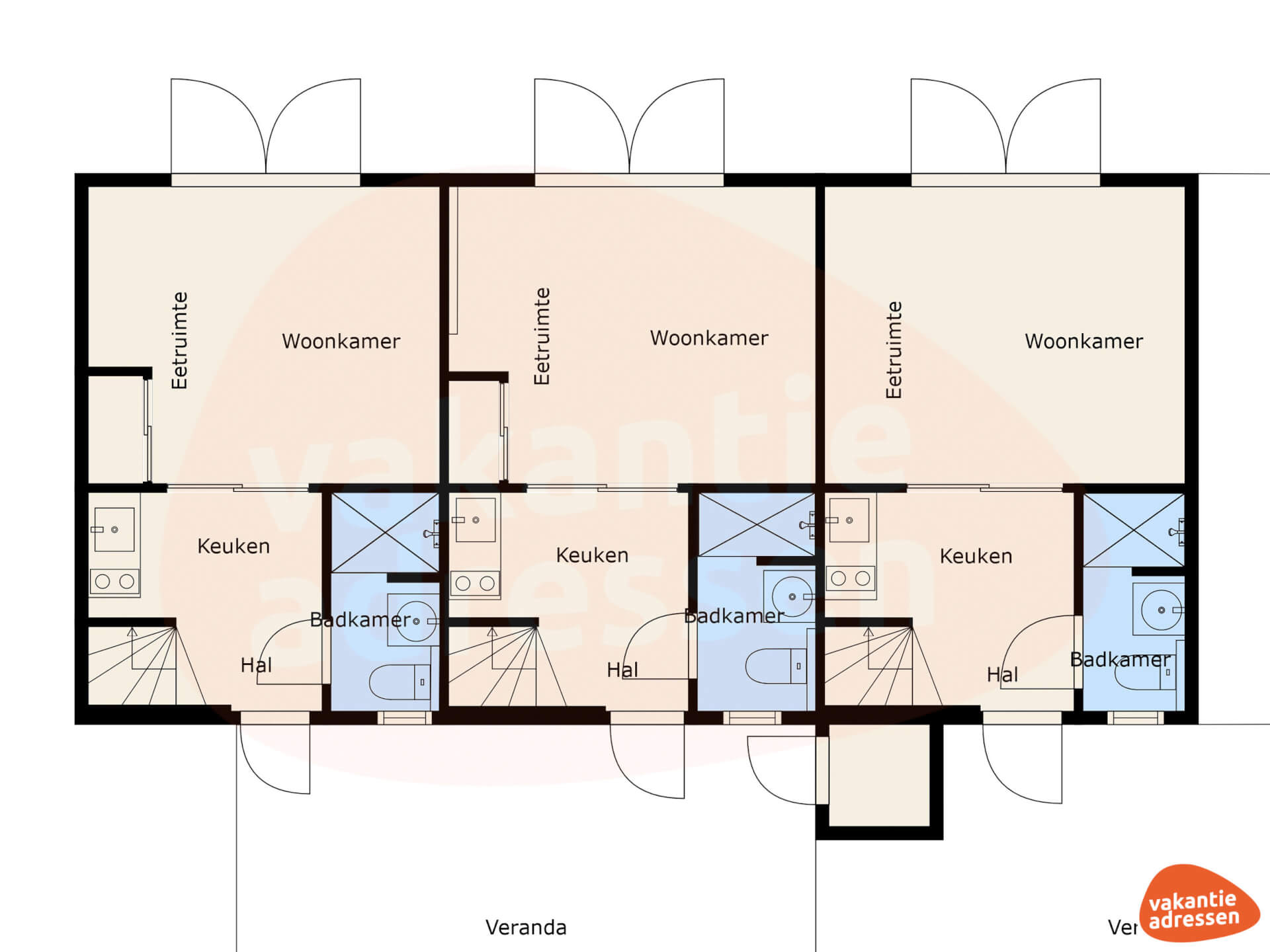 Die 6 Cottages sind für 3 bis 5 Personen ausgelegt (siehe Raumaufteilung) und verfügen im Erdgeschoss über eine Sitzecke, die als zusätzliches Schlafzimmer dienen kann, eine Kochnische und ein Badezimmer. Im Obergeschoss finden Sie ein Schlafzimmer mit 3 Betten und ein kleineres Badezimmer. Vier der sechs Ferienhäuser verfügen über ein 140 x 200 cm großes Schlafsofa in der Sitzecke. In den anderen beiden Häusern kann ein Klappbett in der Sitzecke aufgestellt werden, so dass insgesamt 24 Schlafzimmer zur Verfügung stehen.