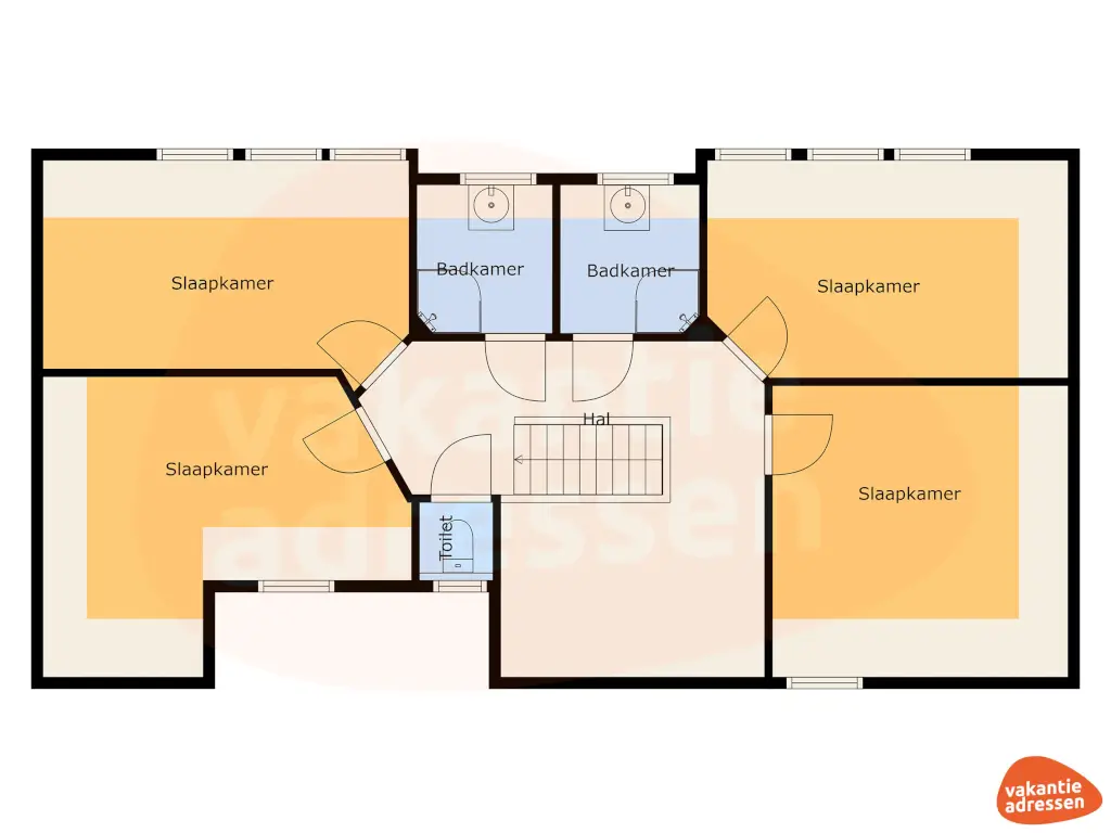 Insgesamt gibt es acht Schlafzimmer in dieser Ferienadresse. Die vier Doppelzimmer im Erdgeschoss sind alle mit einem eigenen Badezimmer mit Dusche, Toilette und Waschbecken ausgestattet. Im Obergeschoss befinden sich vier geräumige Zimmer, die für 2 bis 3 Personen geeignet sind. Auch hier gibt es genügend zentral gelegene sanitäre Einrichtungen, so dass Sie abends und morgens nicht aufeinander warten müssen. Es sind 2 Kinderbetten vorhanden, für die ein Aufpreis erhoben wird.
