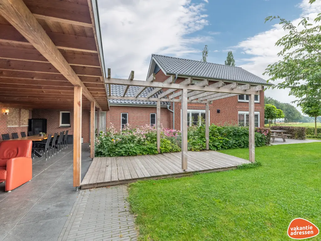 Diese Ferienadresse liegt an der deutschen Grenze in der Achterhoeker Landschaft. Die luxuriöse Villa bietet Platz für 10 Personen und verfügt über 4 Schlafzimmer, 2 Badezimmer, eine Sauna, einen holzbefeuerten Whirlpool, einen Grill und eine große beheizte überdachte Terrasse. Vom Garten mit Schaukel haben Sie einen weiten Blick über die Wiesen. Die große überdachte Terrasse sorgt dafür, dass Sie sowohl im Schatten als auch windgeschützt sitzen können. Der Holzofen sorgt für zusätzliche Atmosphäre und eine angenehme Temperatur. Die Benutzung des Whirlpools, des Holzofens (einschließlich Holzvorrat), der Sauna und des Grills ist im Mietpreis enthalten.