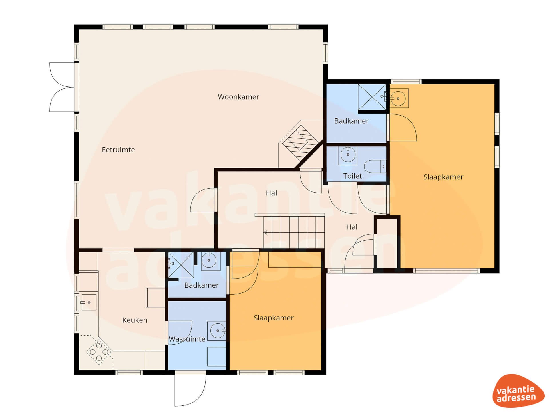 Das Ferienhaus verfügt über 7 geräumige Schlafzimmer: im Erdgeschoss ein Doppelzimmer mit eigenem Bad und ein zusätzliches Zimmer mit Etagenbetten und extra Dusche/Toilette - ideal für Kinder oder als Spielecke. Im Obergeschoss befinden sich weitere 5 Schlafzimmer mit unterschiedlichen Grundrissen (2-, 3- und 4-Bett-Zimmer). Die 3 Badezimmer (eines mit Badewanne) und mehrere Toiletten sorgen dafür, dass jeder den Tag entspannt beginnen und beenden kann, ohne lange Wartezeiten.