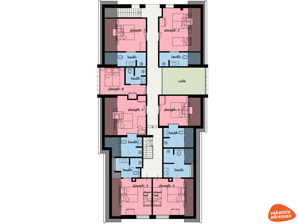 Schlafzimmer 6: 2x Einzelbett + 1x Etagenbett + Dusche, Toilette und Waschbecken
